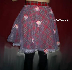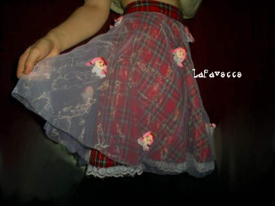 Tartan skirt covered in white mesh with strawberry lolita girl face decoration. Frill at the bottom.